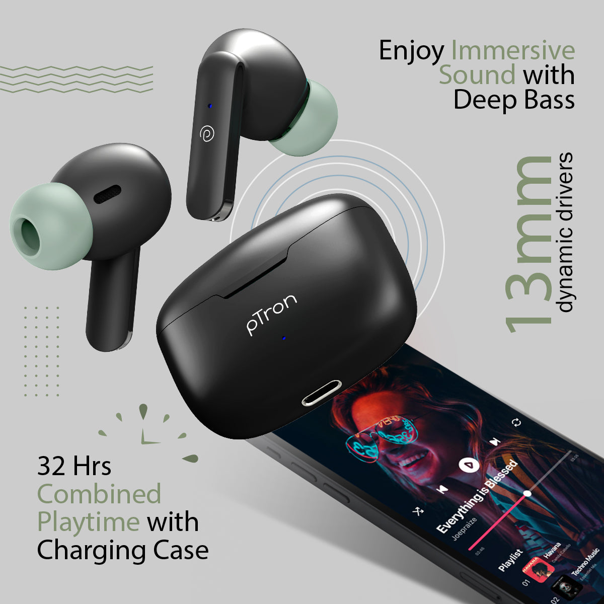 pTron Bassbuds Joy in-Ear Wireless Earbuds, Immersive Sound, 32Hrs Playtime, Clear Calls TWS Earbuds, Bluetooth V5.1 Headphone, Type-C Fast Charging, Voice Assist & IPX4 Water Resistant (Black & Green)