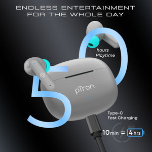 pTron Bassbuds Zen In-Ear TWS Earbuds with Quad ENC Mic, 50Hrs Playtime, Low Latency, Bluetooth 5.3 Wireless Headphones, Deep Bass, Touch Control, Type-C Fast Charging & IPX4 Water Resistant (Grey)...