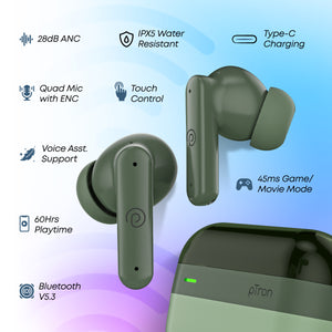 pTron Zenbuds 1 ANC Earbuds, 28dB Active Noise Cancellation TWS, Quad Mic TruTalk ENC Calls, 60Hrs Playtime, 45ms Game/Movie Mode & In-Ear Bluetooth v5.3 Wireless Headphones (Green) Hybrid ANC Earbuds:...