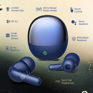 pTron Zenbuds Evo TWS Earbuds, AI-TruTalk ENC Calls, 45ms Movie/Music Modes, Deep Bass, 32Hrs Playtime, Bluetooth v5.3 Headphones, IPX5 Water Resistant & Type-C Fast Charging (Blue) Large 13mm dynamic drivers...