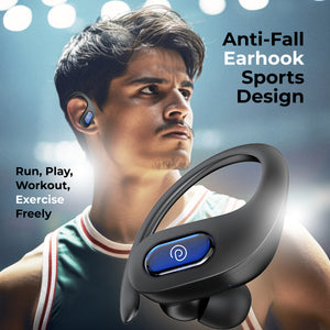 pTron Bassbuds Sports In-Ear TWS Earbuds with Ultra HD Mic, 13mm HyperDrive Transducers with Bass Emitters, 45H Playtime, 45ms HyperLow-Latency, BTV5.3 Wireless Headphones, Type-C Charging & IPX5 (Black) Ergonomic Hook...