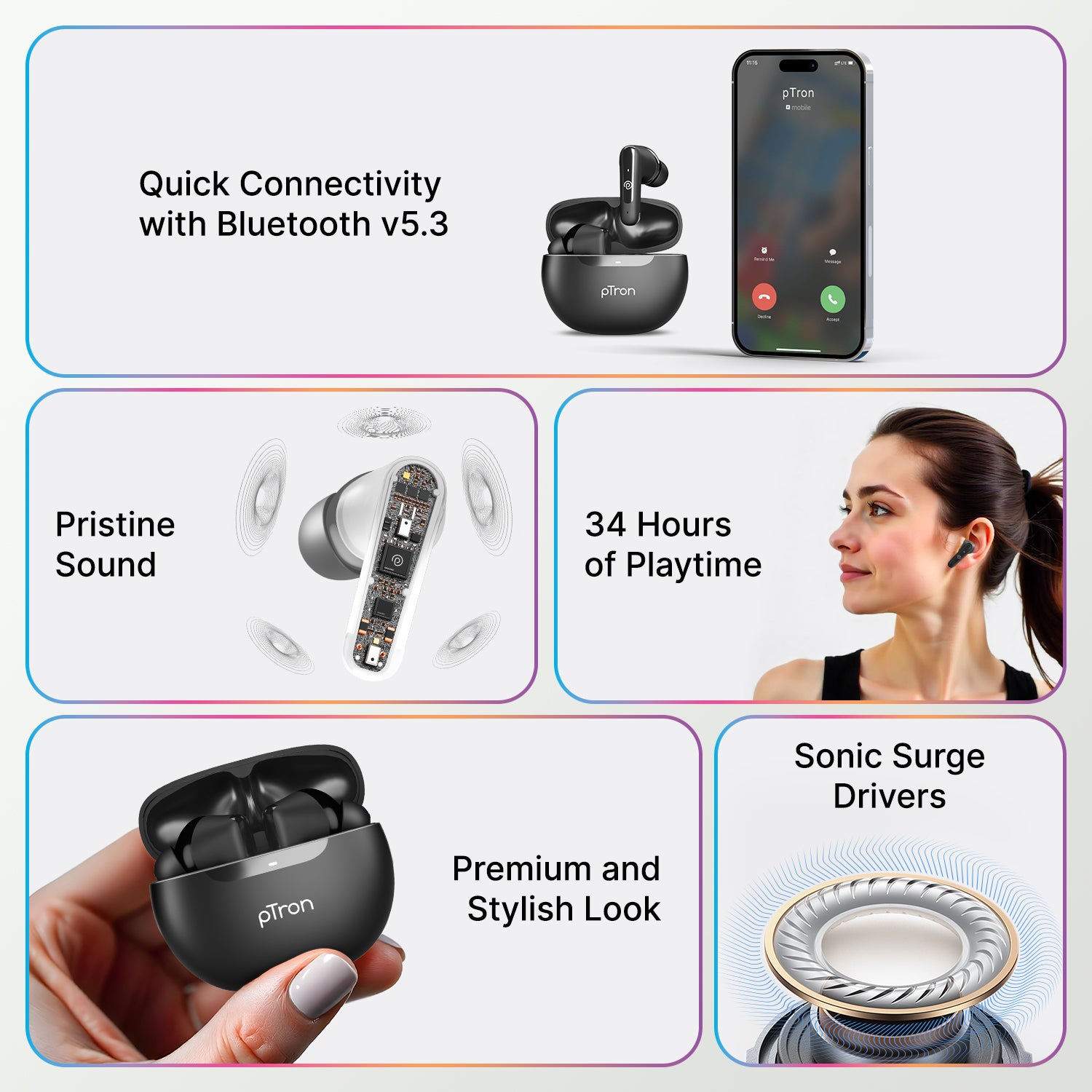 pTron Bassbuds Joy In-Ear TWS Earbuds with Stereo Sound, 34Hrs Playtime, Stereo Calls, Bluetooth V5.3 Headphone with Quick Pairing, Touch Control, Voice Assist, Type C Charging & IPX4 (Black)