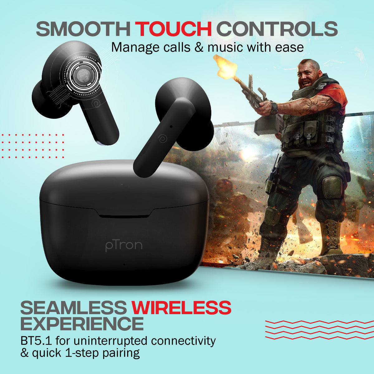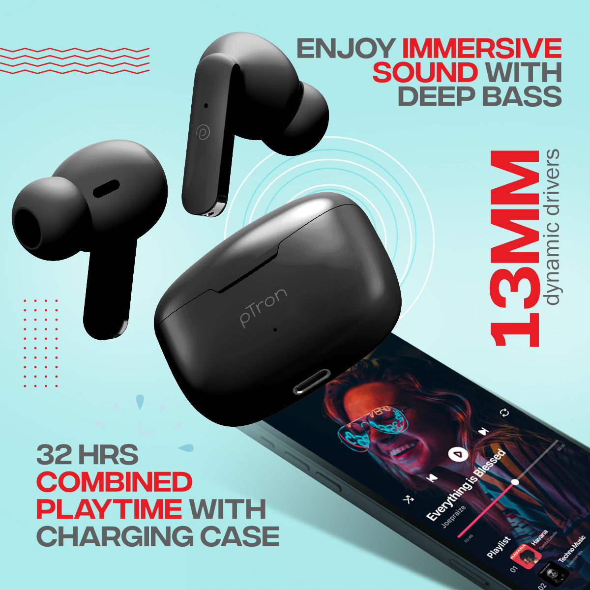 pTron Bassbuds Joy in-Ear Wireless Earbuds, Immersive Sound, 32Hrs Playtime, Clear Calls TWS Earbuds, Bluetooth V5.1 Headphone, Type-C Fast Charging, Voice Assist & IPX4 Water Resistant (Black Matt)