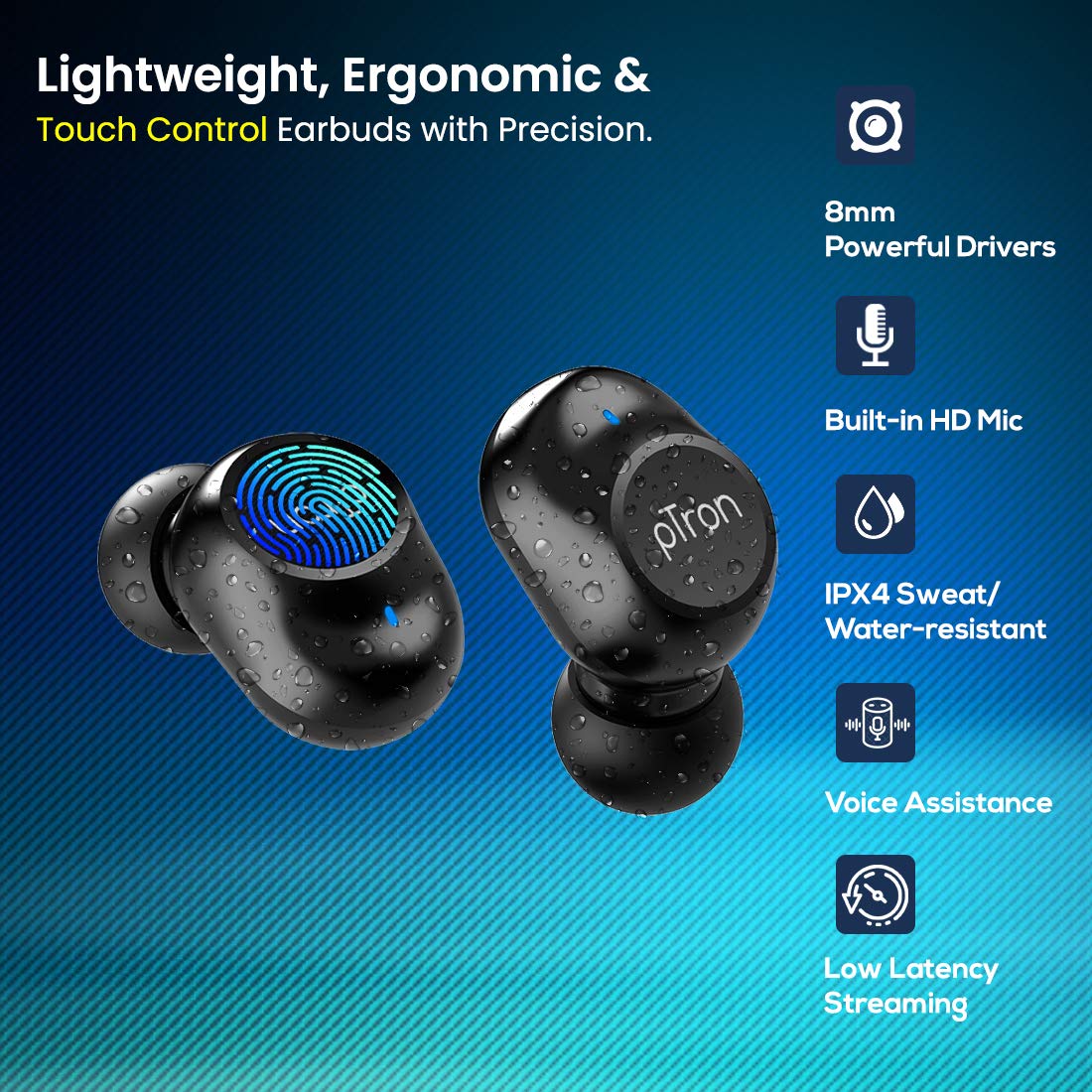 pTron Bassbuds Pro (New) in-Ear True Wireless Bluetooth 5.1 Headphones with Deep Bass, Touch Control Earbuds, IPX4 Water/Sweat Resistance, Digital Display Case, Earphones with Built-in Mic - (Black)