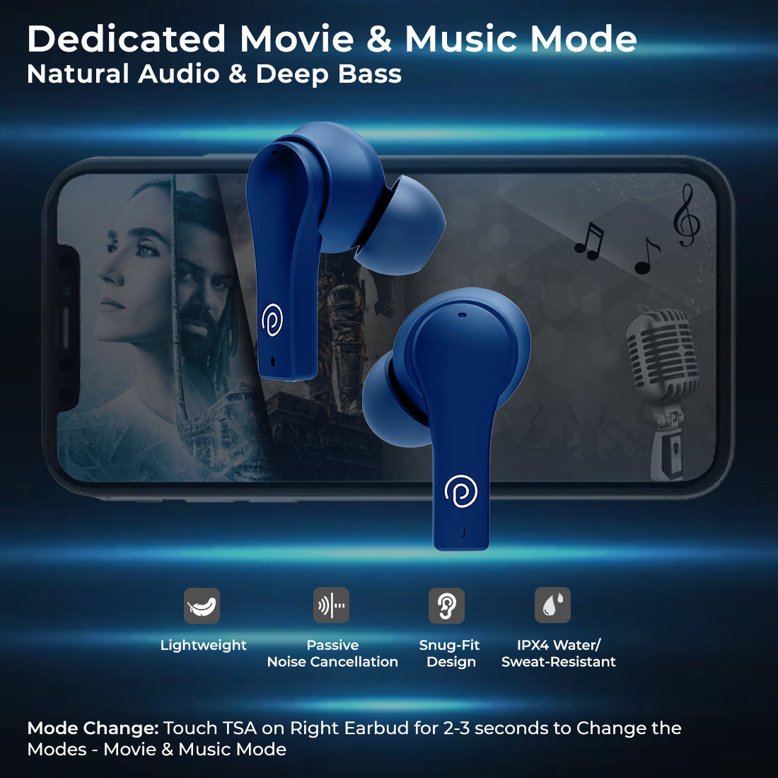 pTron Bassbuds Tango in-Ear TWS Earbuds, TruTalk AI-ENC Calls, Movie Mode, 40Hrs Playtime, Bluetooth 5.1 Headphone with HD Mics, Touch Control, IPX4 Water-Resistant & Type-C Fast Charging (Blue)