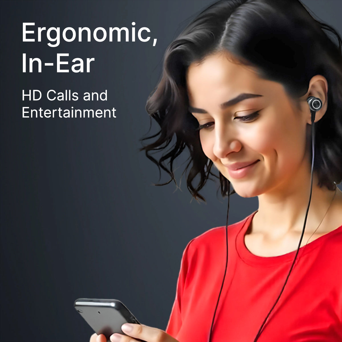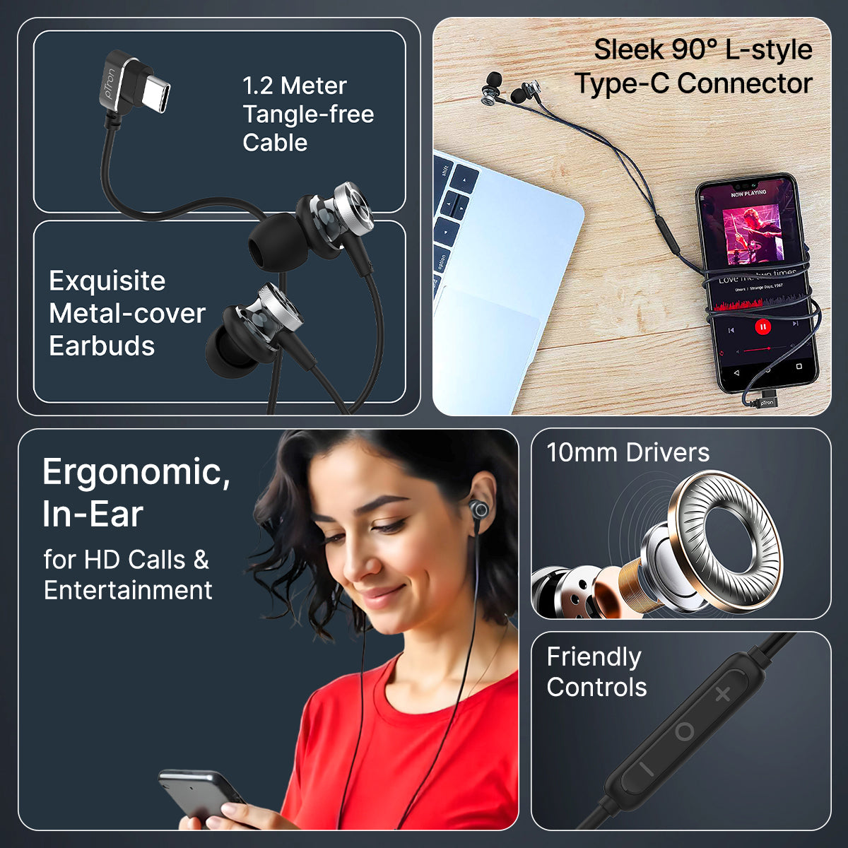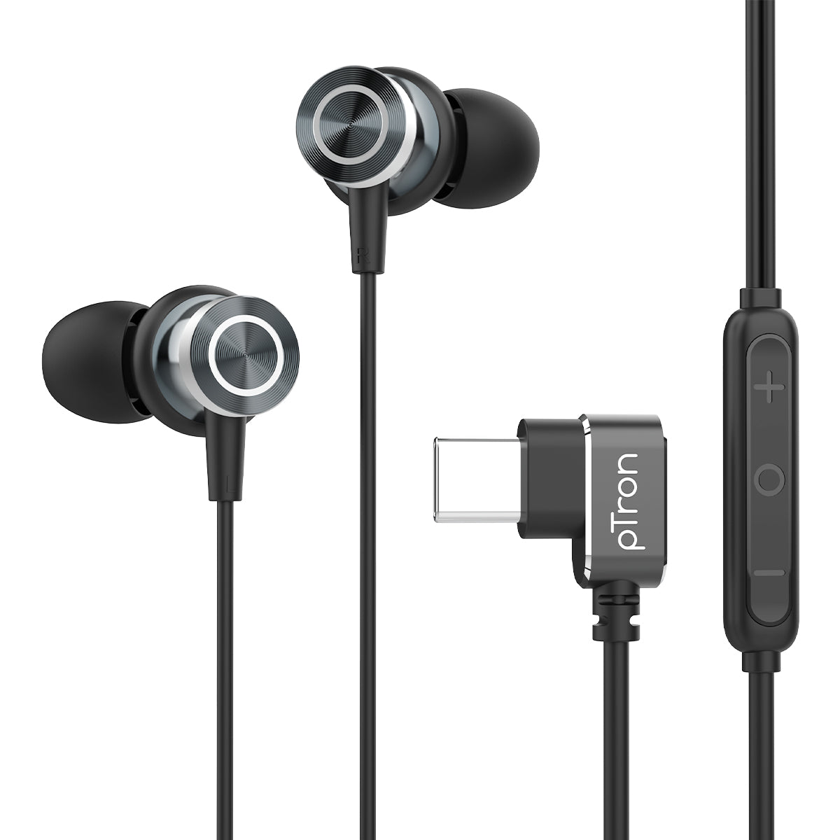 pTron Boom Play X3 In-Ear Type C Wired Headphones with Mic, 10mm Drivers for Pristine Sound, In-line Controls, 90 Degree USB-C Connector, 1.2m Tangle-Free Cable, Metal Buds & Wide Compatibility (Black)