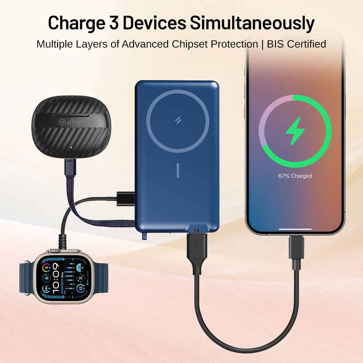 pTron Dynamo Dash Magnetic Wireless 10000mAh Fast Charging Slim Power Bank, Strong Magnet, 22.5W Output, Compatible w/iPhone 12/13/14/15/16, Android & Other Qi Enabled Devices, Type-C Input (Blue)