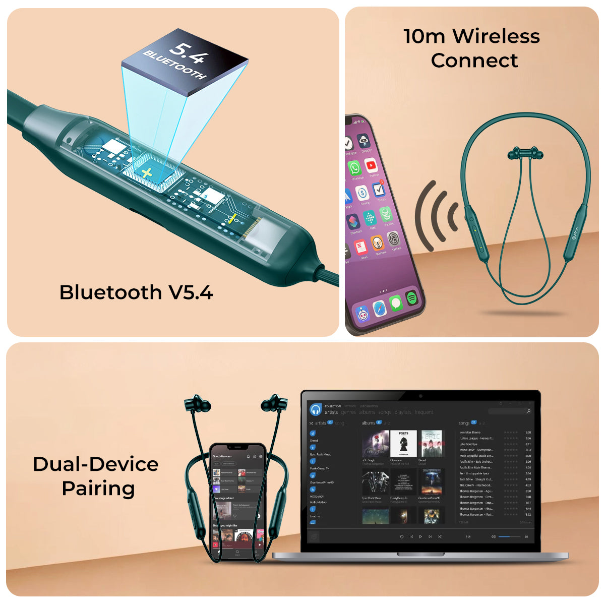 pTron Tangent Rush w/ 50Hrs Playtime, Pristine Sound, Dual-Device Pairing, Bluetooth 5.4 Wireless in-Ear Earphones with Mic, Voice Assistant, Type-C Fast Charging & IPX5 Water Resistant (Green)